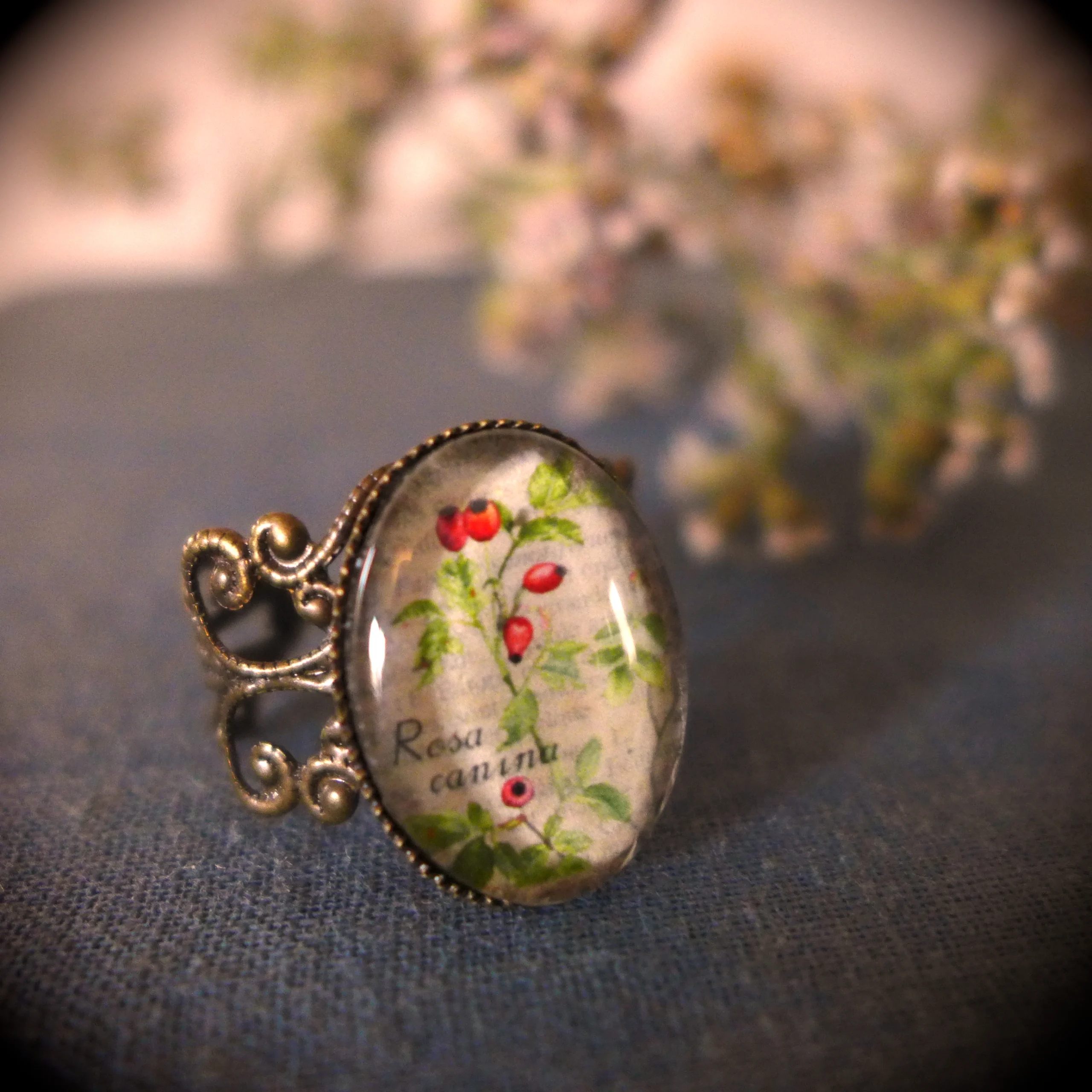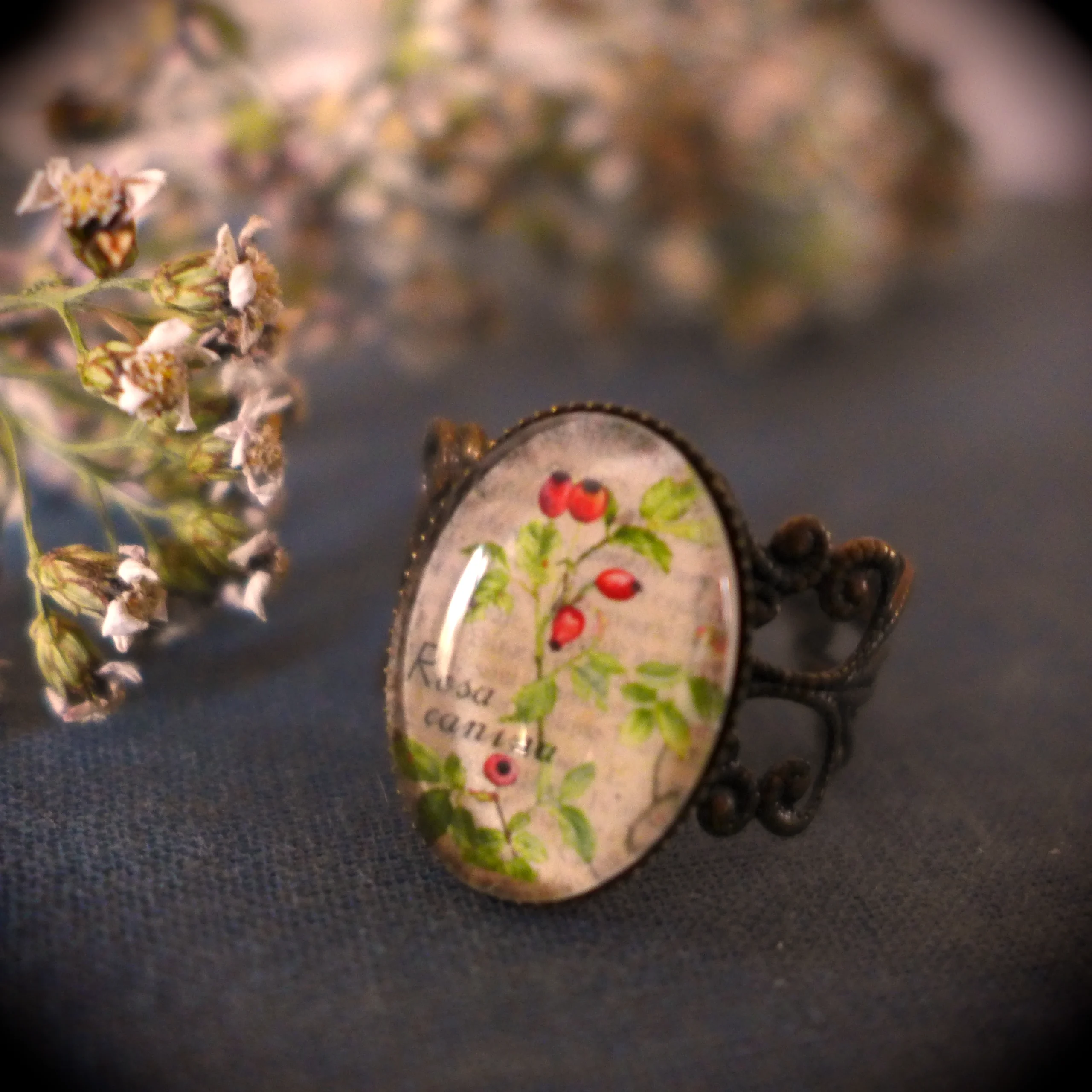 Pour créer cette jolie bague, j’ai miniaturisé mon aquarelle de branche d’Églantier et je l’ai placée sous un cabochon en verre ovale de 13 x 18 mm.