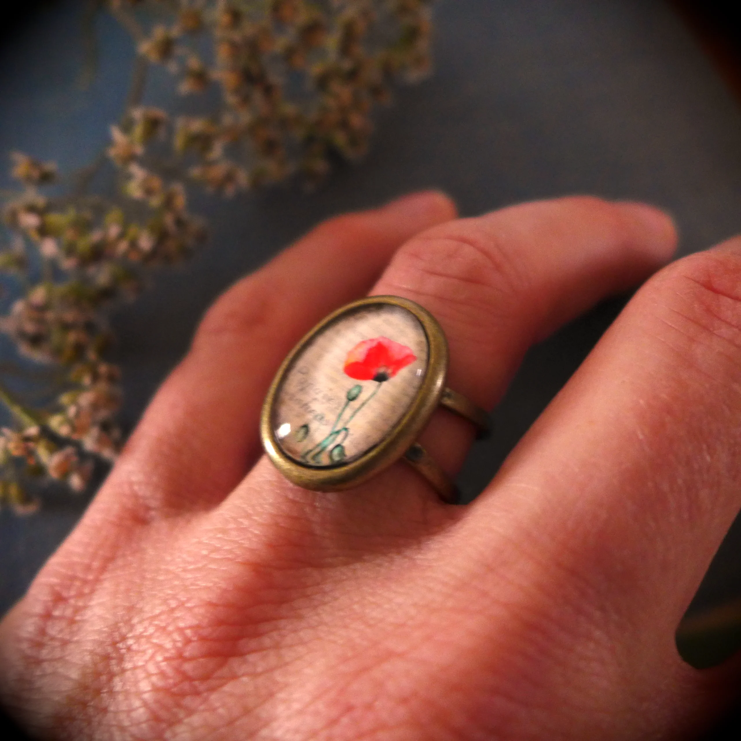 Pour créer cette jolie bague, j’ai miniaturisé mon aquarelle de Fleur de Coquelicot et je l’ai placée sous un cabochon en verre ovale de 13 x 18 mm.