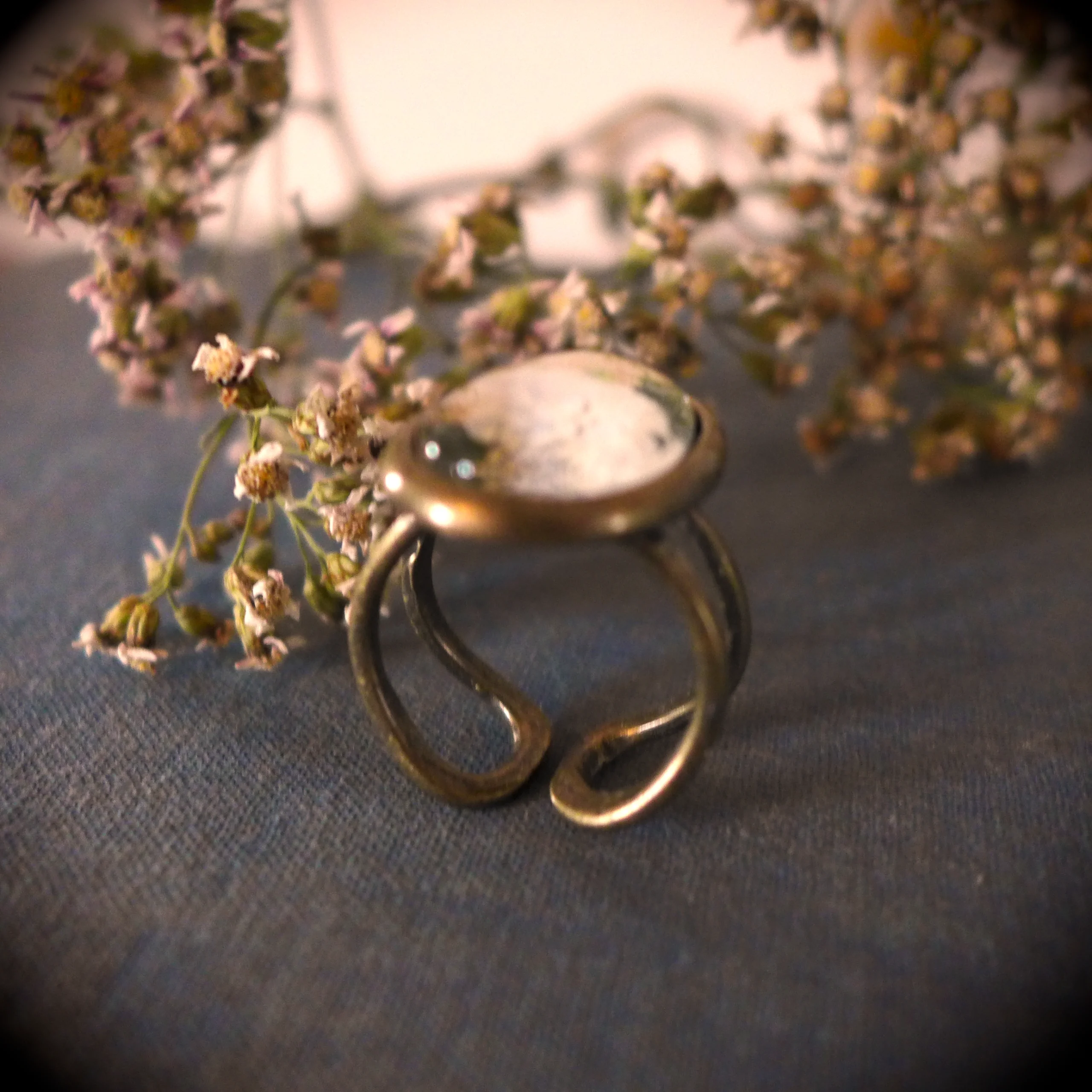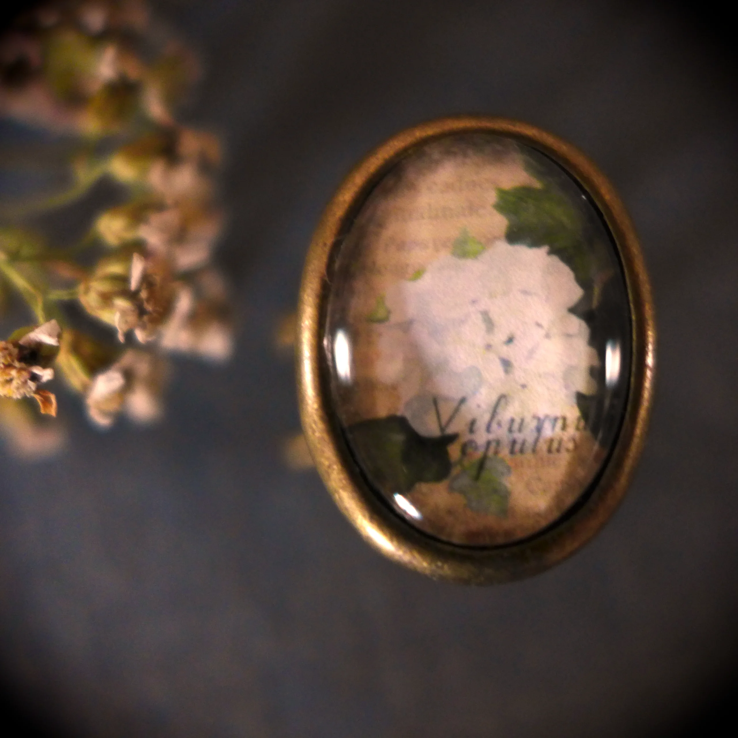 Pour créer cette jolie bague, j’ai miniaturisée mon aquarelle Viorne en fleur, et je l’ai placée sous un cabochon en verre ovale de 13 x 18 mm.