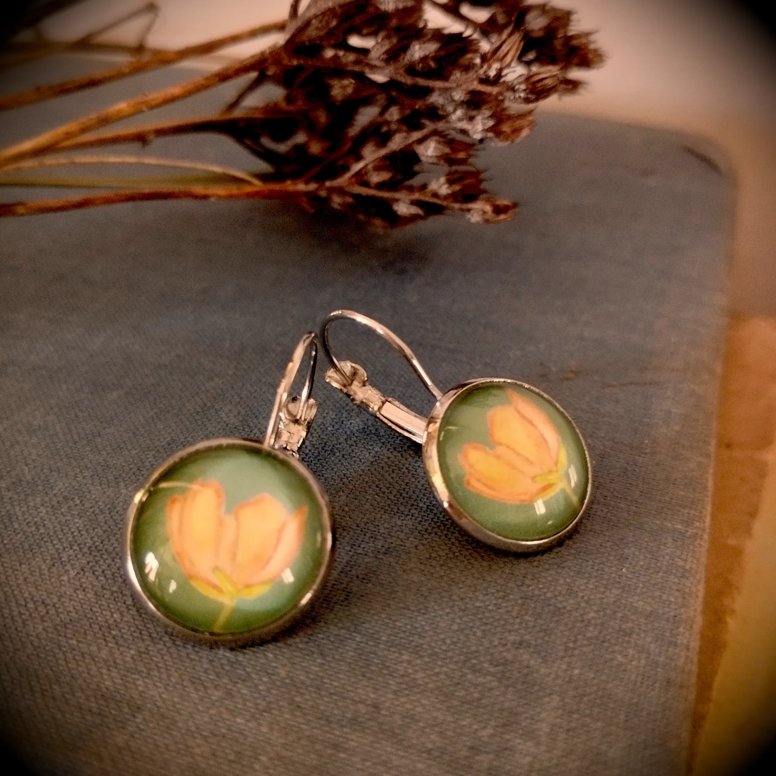 Boucles d’oreilles Vintage, fermeture dormeuse, illustrées Fleur de Bouton d’Or.