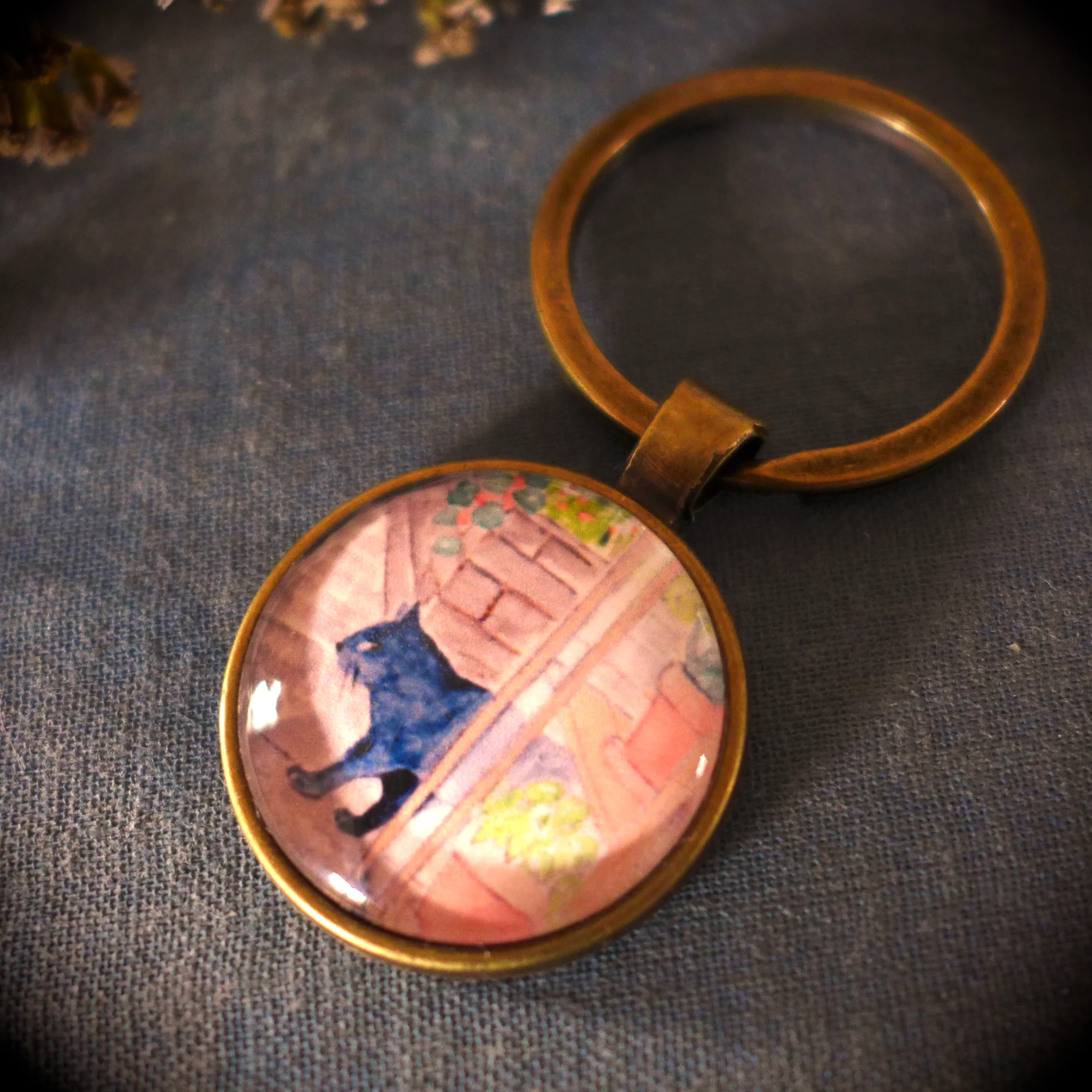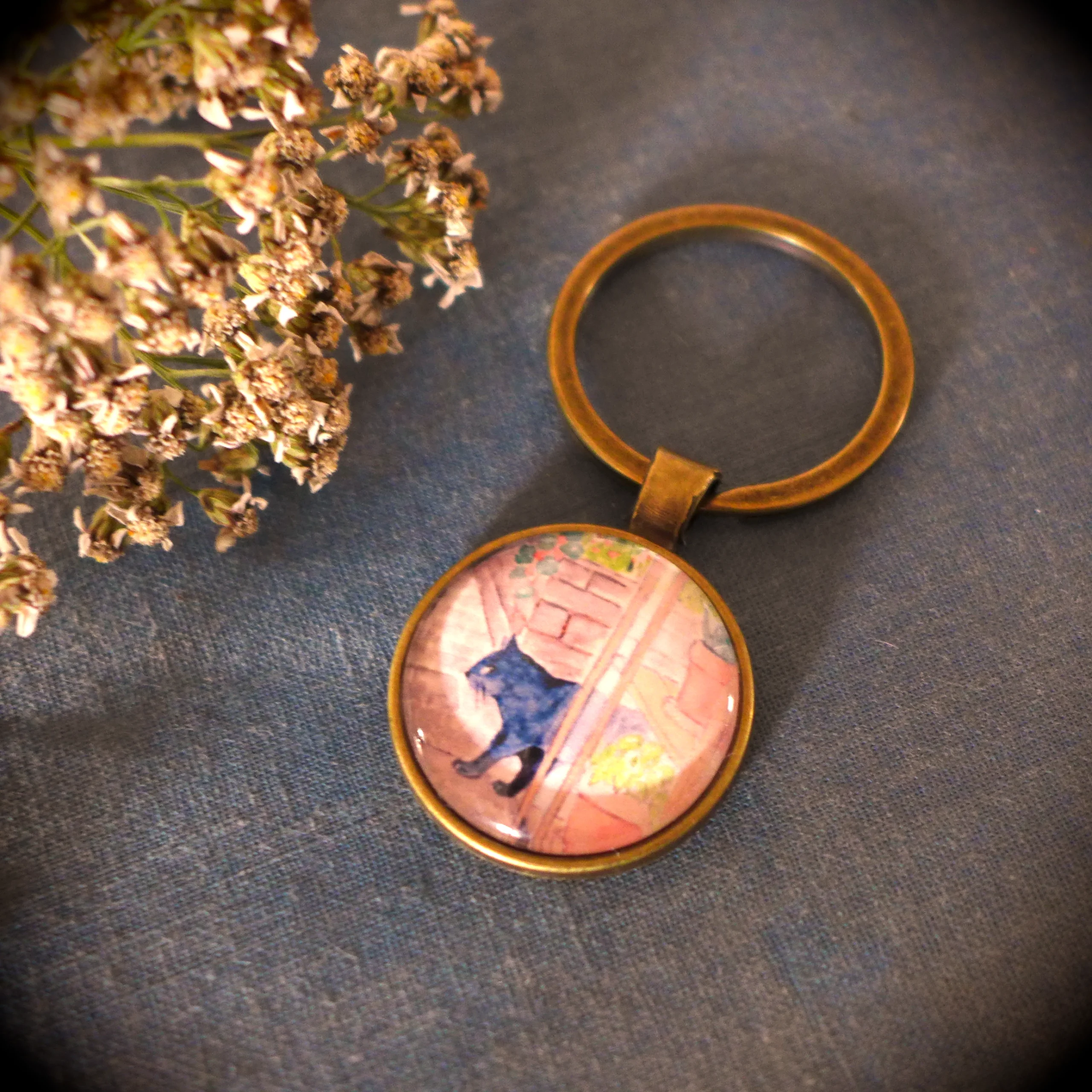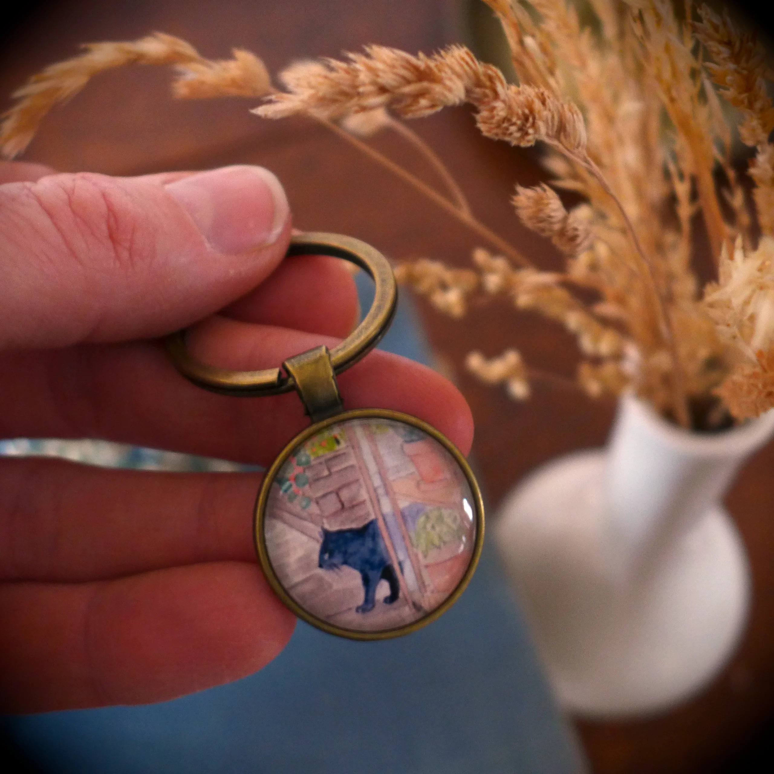 Pour créer ce porte-clé cocooning « chat au jardin », j’ai miniaturisé mon aquarelle et je l’ai placée sous un cabochon en verre rond.