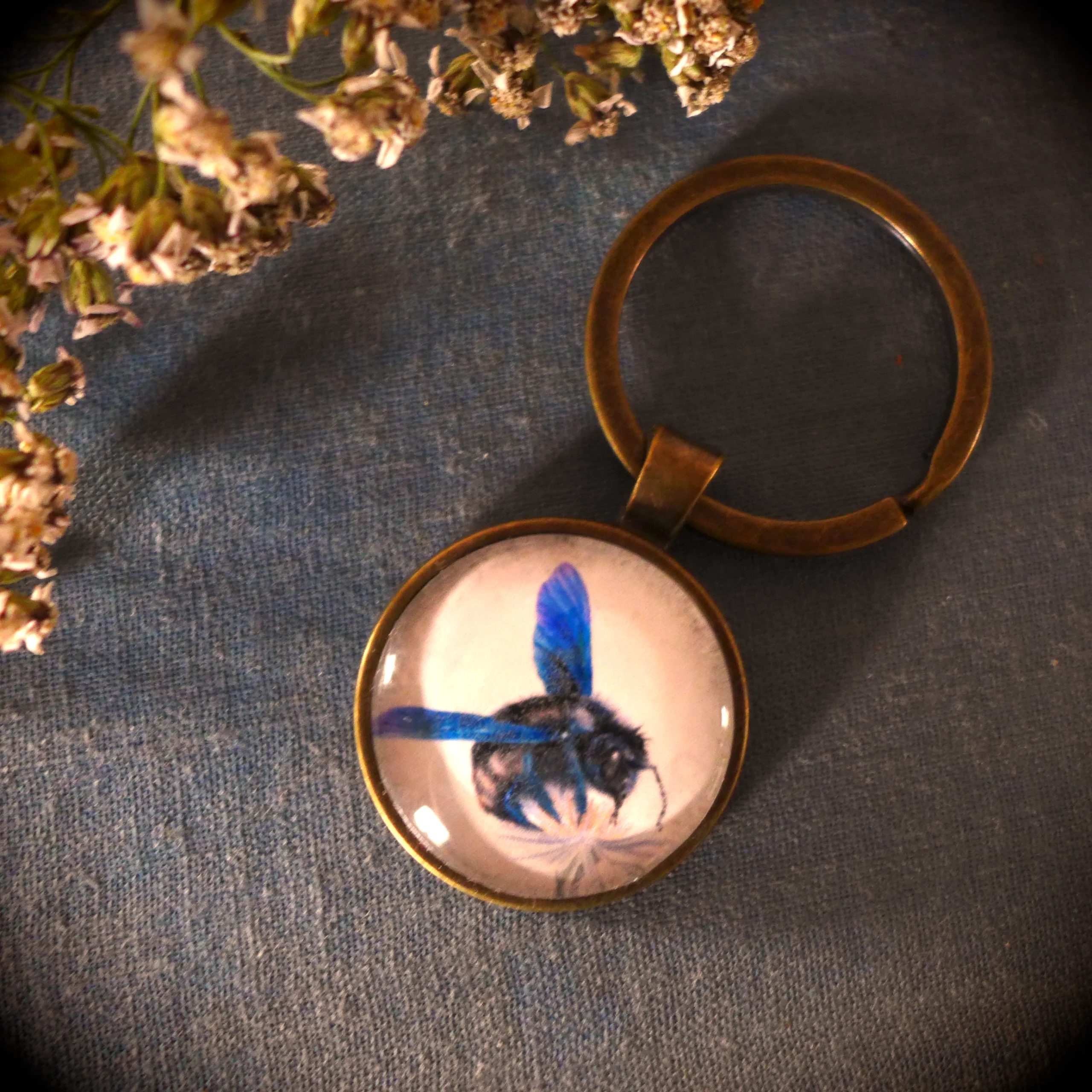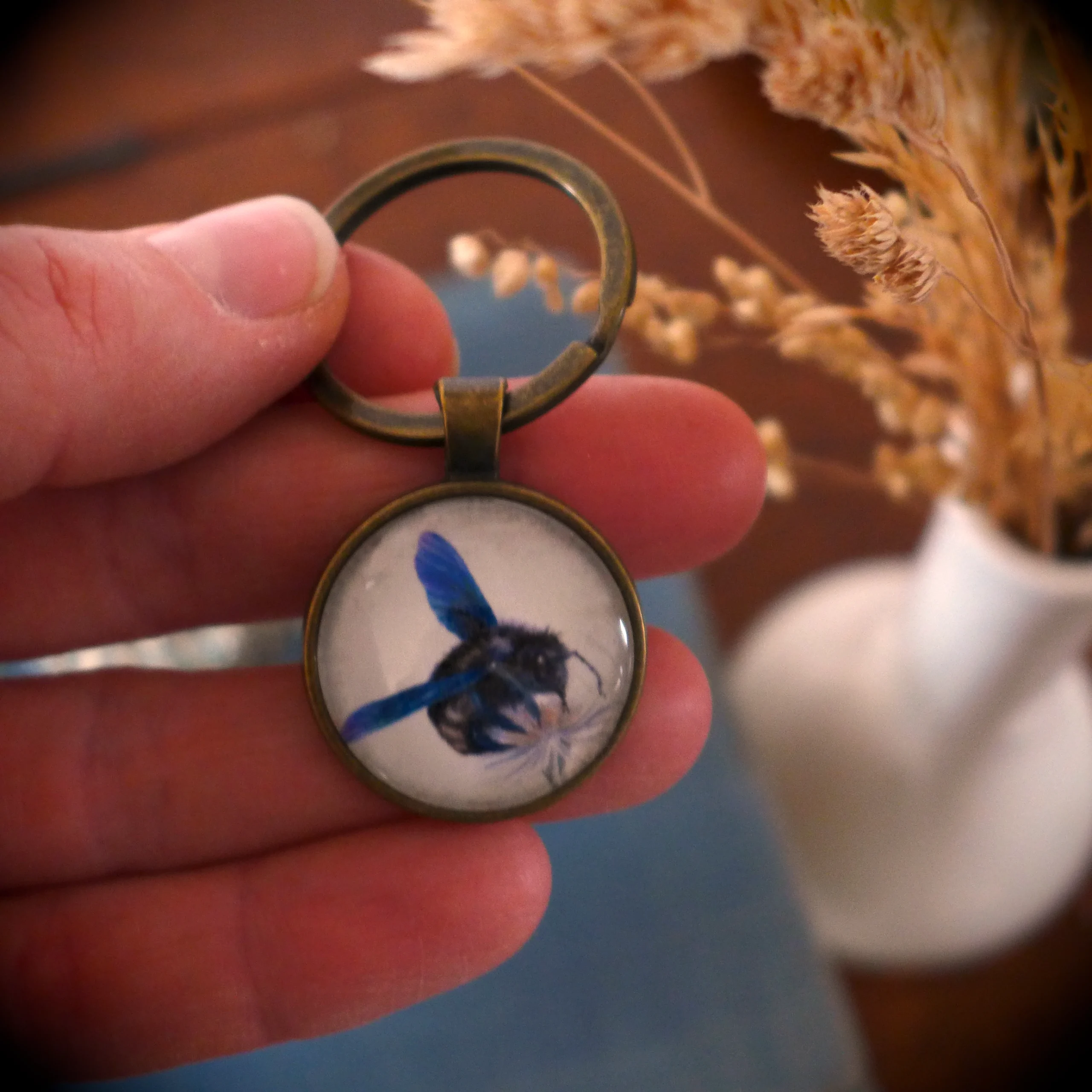 Pour créer ce porte-clé nature abeille « Abeille charpentière », j’ai miniaturisé mon aquarelle et je l’ai placée sous un cabochon en verre rond.