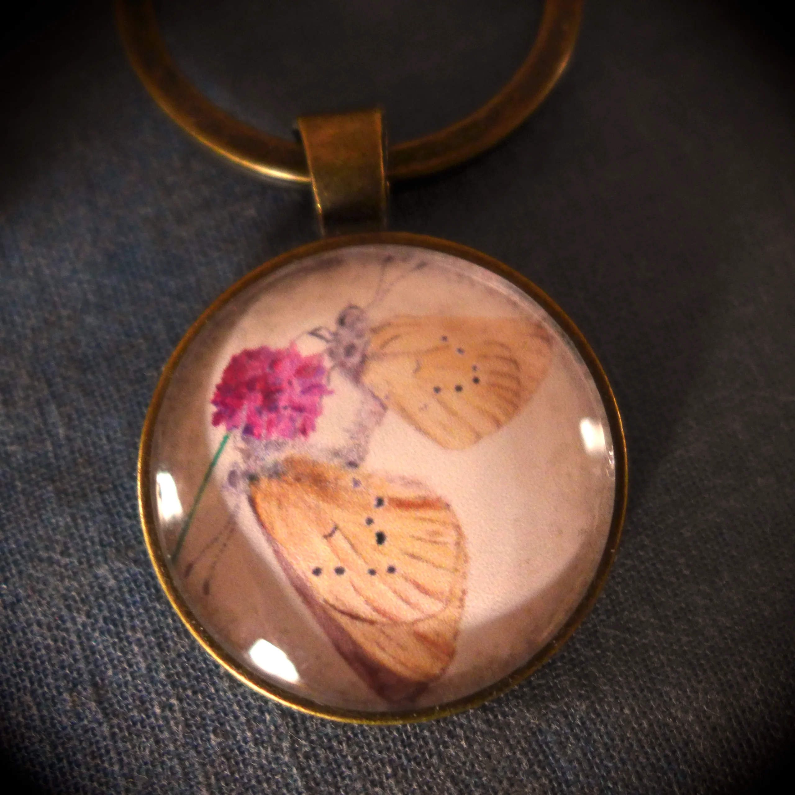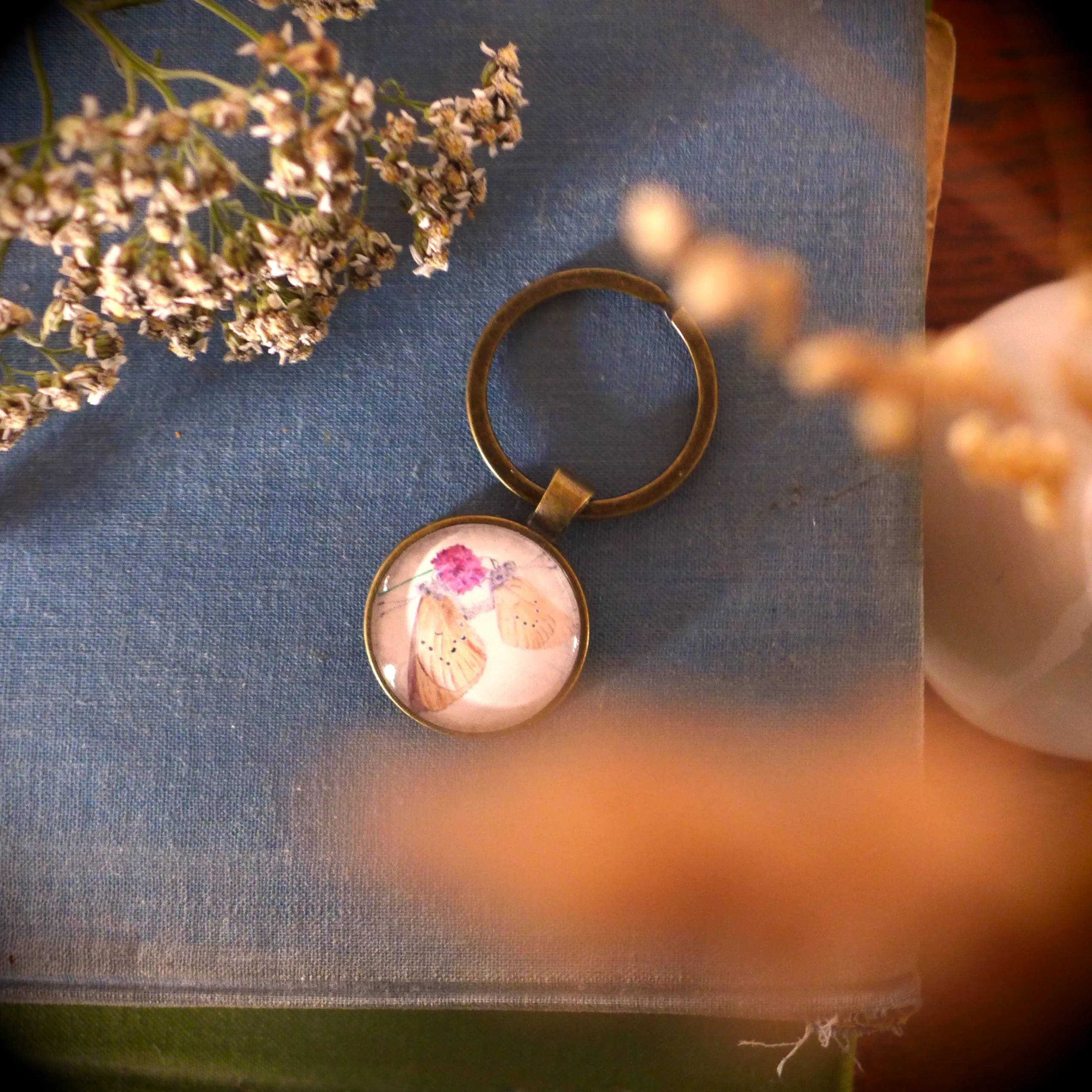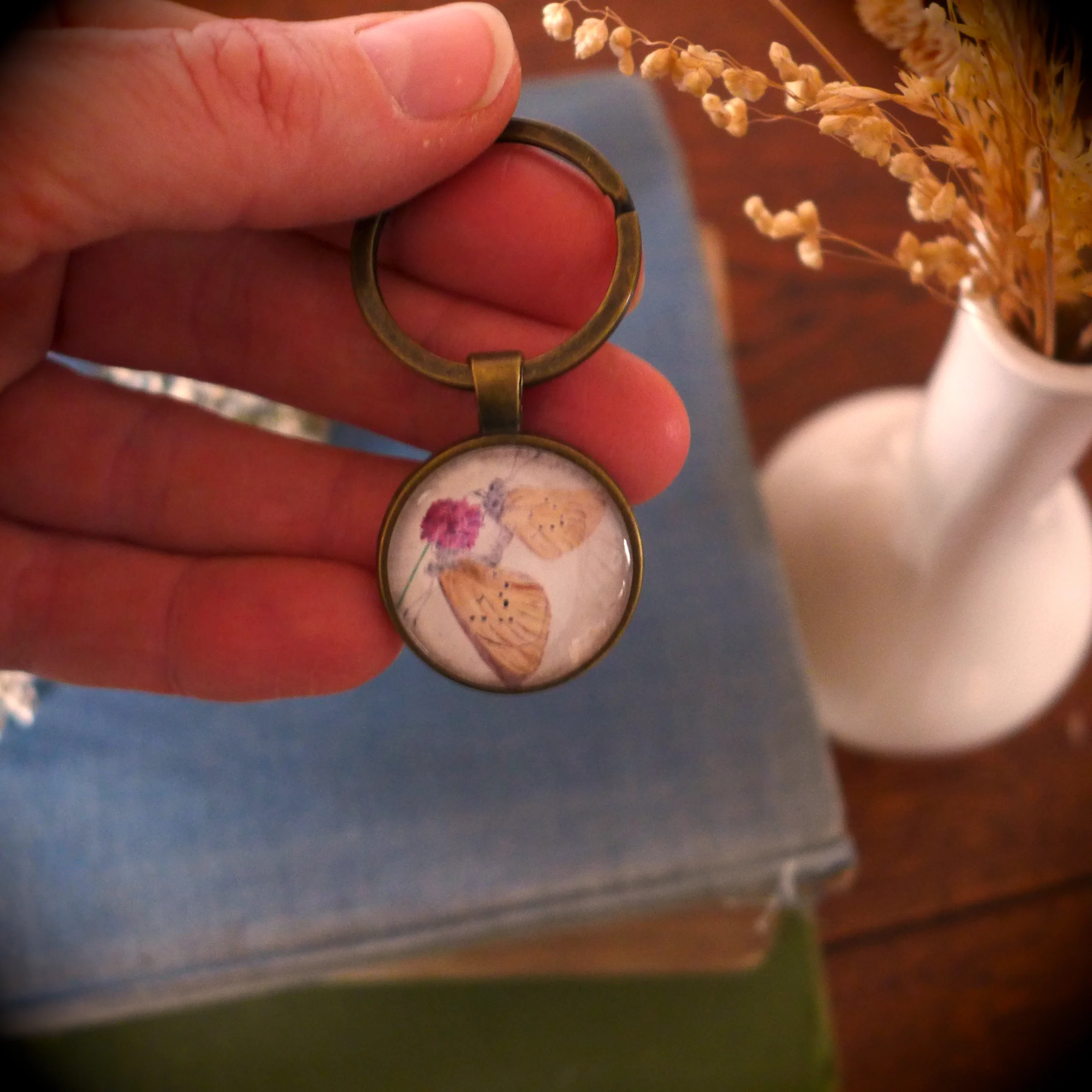 Pour créer ce porte-clé nature papillon « Azurés des paluds », j’ai miniaturisé mon aquarelle et je l’ai placée sous un cabochon en verre rond.
